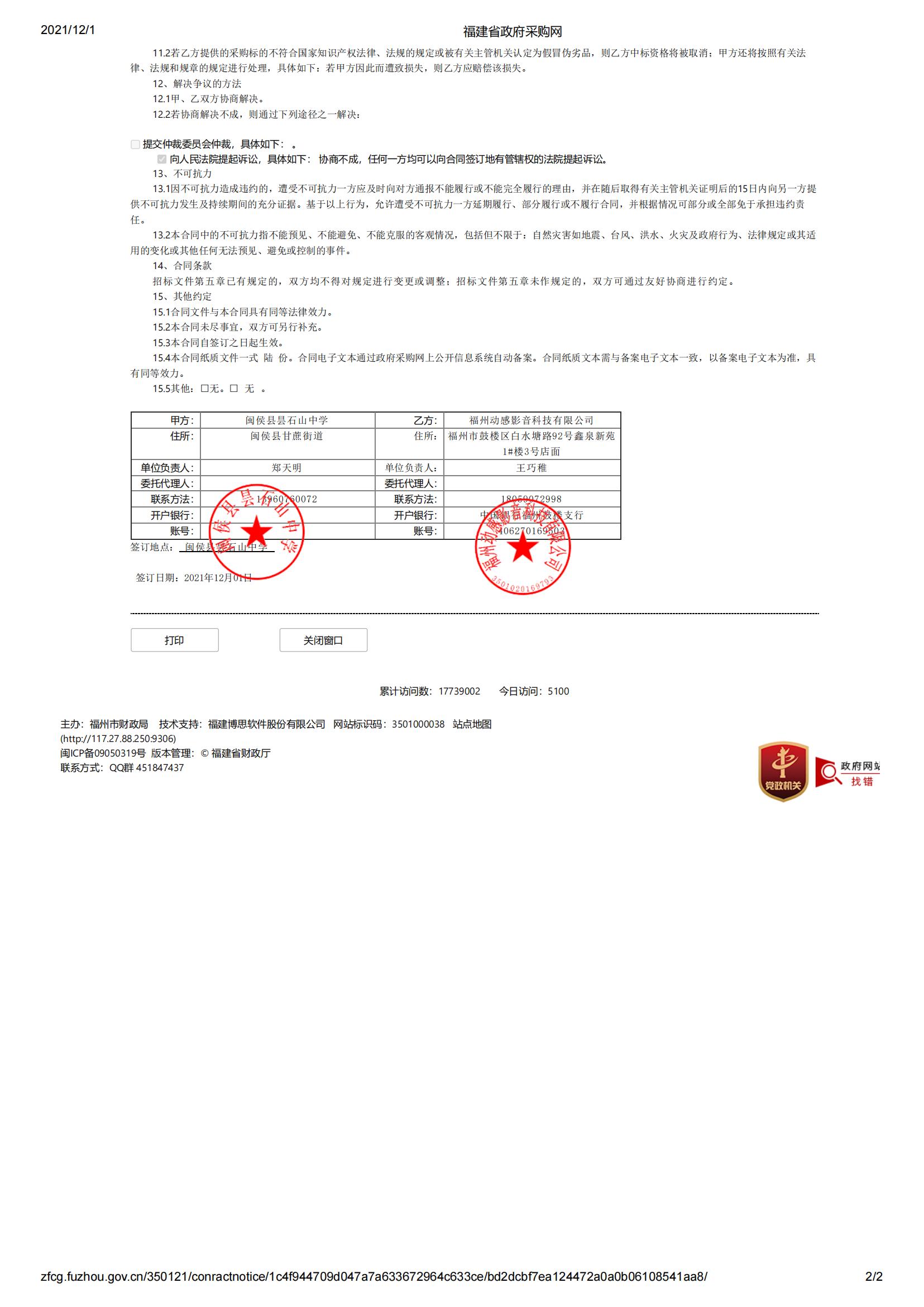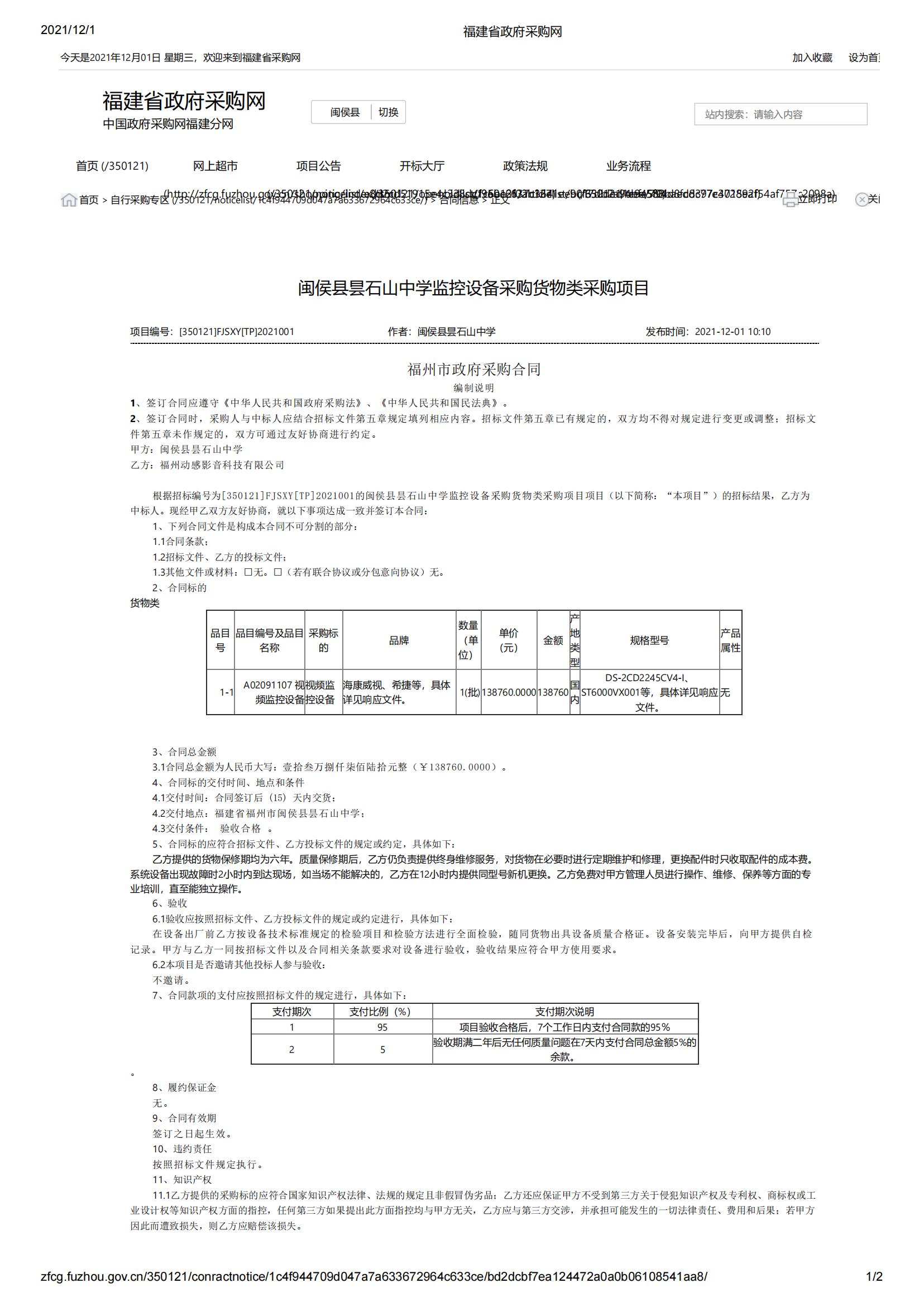 闽侯县昙石山中学监控设备采购货物类采购项目采购合同公示